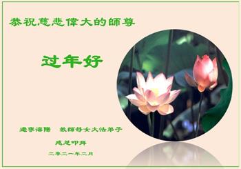 至此牛年新春佳节来临之际,向慈悲伟大的师尊致以诚挚的问候,师尊您辛苦了!师尊过年好!弟子无以回报师尊的慈悲苦度之恩,唯有不辱使命、精進做好三件事。兰州安宁区高校部份大法弟子敬上。