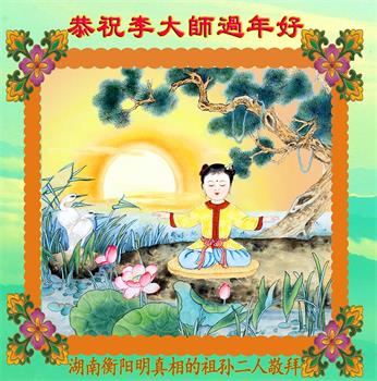 湖南省衡阳明真相的祖孙二人恭祝李大师过年好!