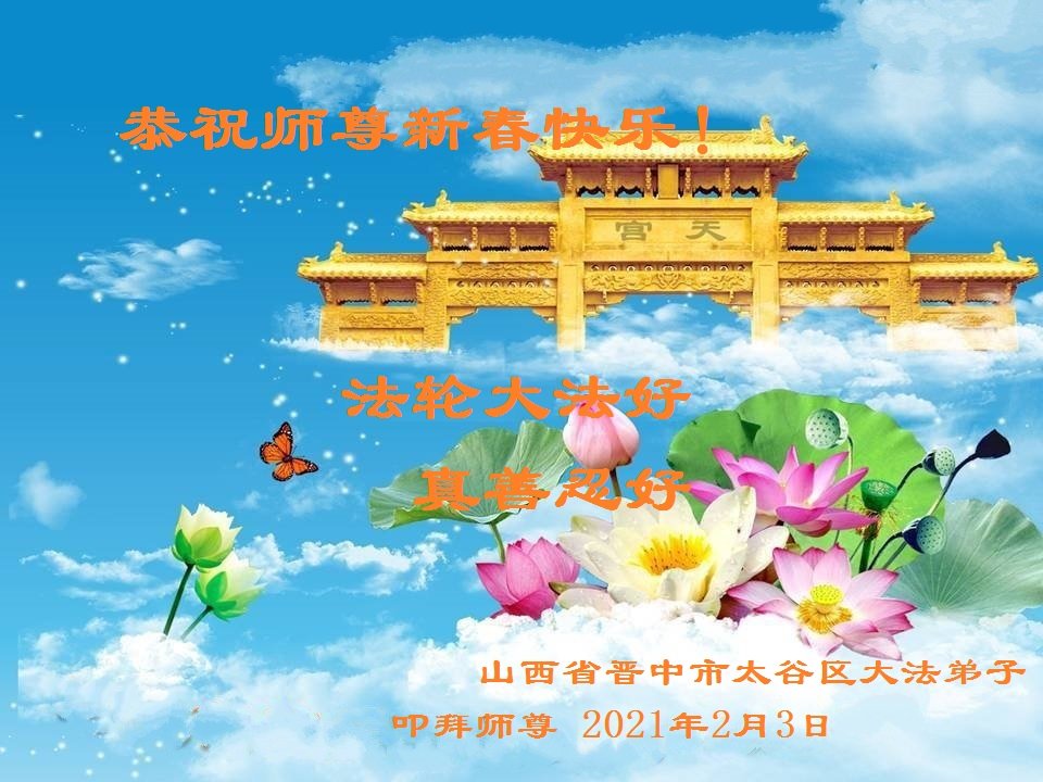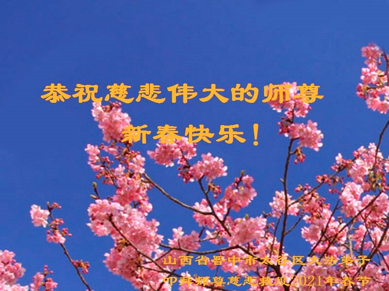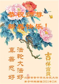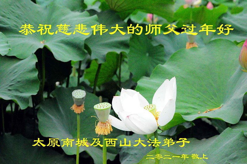尊敬的师父,我们山西太原地区全体大法弟子叩拜师父,恭祝师父过年好! 师父您辛苦了!感恩师父的慈悲救度,我们一定听师父的话,走好走正最后的路,完成历史使命,兑现史前大愿,圆满随师还。 山西太原地区全体大法弟子敬拜 二零二一年