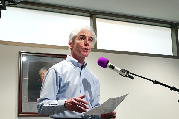 威廉王子县居民、法轮功学员吉姆·吉拉戈西亚(Jim Giragosian)博士在发言中说:“我请求,让我们记住中国的法轮功修炼者,他们在过去21年里遭到了非法的监禁和酷刑,现在他们因为其器官(被攫取)而正在被处死。”  图4:威廉王子县居民、法轮功学员吉姆·吉拉戈西亚(Jim Giragosian)博士在发言中。 |