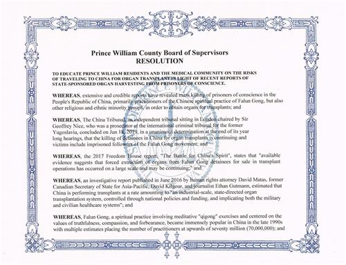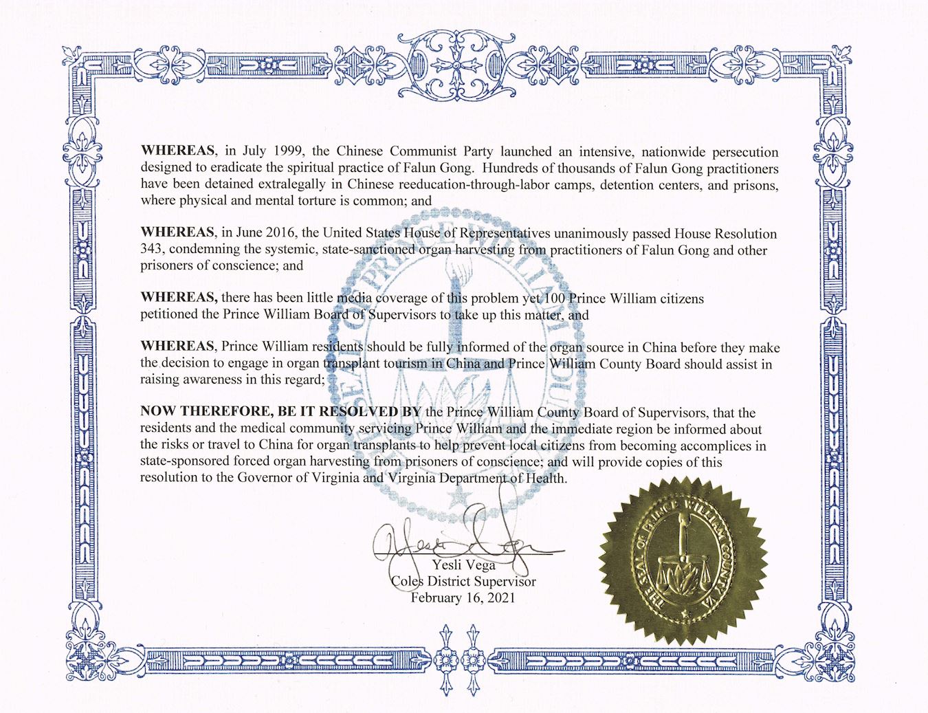 以下是决议案的全文内容翻译: 图6~7:决议案原文威廉王子县委员会决议案根据(中共)国家支持的活摘良心犯器官的最近报告,对威廉王子县居民和医疗界进行前往中国做器官移植手术的风险教育; 鉴于,广泛和可信的报告显示,在中国存在对良心犯、首要是法轮功修炼者,以及其它宗教和少数群体成员的大规模杀戮,以获取器官做移植手术;以及 鉴于,中国法庭(The China Tribunal),这个位于英国伦敦由大爵士、国际刑事法庭审判前南斯拉夫问题的检察官Geoffrey Nice QC主持的独立法庭,经过长期听证,在2019年6月18日做出判决,一致认定:在中国,杀戮囚犯,用于器官移植手术的行径正在继续,受害者包括被监禁的法轮功学员;以及 鉴于,“自由之家”在2017年发布的《中国精神之战》(The Battle for China’s Spirit)报告中指出,“现有证据表明,活摘法轮功囚犯的器官,用于器官移植手术的交易,已经大规模发生,并可能正在继续;”以及 鉴于,由人权律师大卫‧麦塔斯(David Matas)、前加拿大亚太事务卿大卫‧乔高(David Kilgour)、记者伊桑‧葛特曼(Ethan Gutmann)在2016年6月发布的调查报告估计,中国正在以“工业规模、国家指导的器官移植系统、国际政策和资金支持、牵涉到军队和民营医疗系统”的方式进行器官移植,就如大卫‧乔高在2016年欧洲议会演讲中所描述的那样;以及 鉴于,法轮功,是以真、善、忍价值为核心,融合了气功打坐练习的精神修炼功法,20世纪90年代在中国广受欢迎;据多项估计,法轮功学员人数当时达到了七千万人以上;以及 鉴于,1999年7月,中国共产党发起了旨在消灭法轮功的全国性的严重迫害。成千上万的法轮功学员被非法拘留在中共的劳教再教育场所、拘留所和监狱中,普遍遭受酷刑迫害和精神折磨;以及 鉴于,2016年6月,美国国会众议院一致通过了343号决议案,谴责对法轮功学员和其他良心犯的系统性的、国家认可的活摘器官行径;以及 鉴于,几乎没有媒体对此问题予以报导,但100位威廉王子县的居民向威廉王子县委员会(Prince William Board of Supervisors)请愿,要求处理此事;以及 鉴于,威廉王子县居民在决定到中国进行器官移植旅游之前,应该被充分告知中国的器官来源,而威廉王子县委员会应协助提升这方面的认知; 因此,现在由威廉王子县委员会决议,通知威廉王子县的居民和服务威廉王子县以及附近地区的医疗界有关前往中国进行器官移植的风险,以帮助制止居住在当地的公民无意间成为(中共)国家认可的活摘良心犯器官行径的共谋;并向弗吉尼亚州州长和弗吉尼亚州卫生署提供该决议案的副本。 Yesli Vega (签字) Coles区委员 2021年2月16日