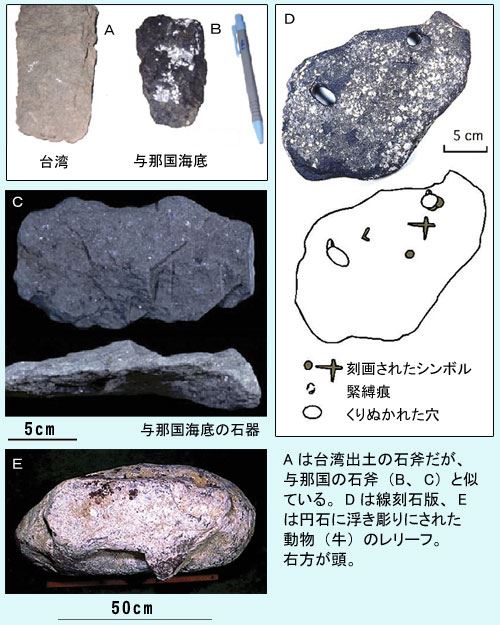 (二)太平洋区域的海底建筑 1986年,潜水员基哈奇罗·辛卡库(Kihachiro Shinkaku)在日本与那国岛海底(与那国島の遺跡)偶然发现了一块人工楼梯结构。1992年起,琉球大学海底调查组和物理与地球科学系研究人员开始广泛的调研。他们采用了潜水、三维地形测绘、水下机器人等多种方式采集数据,结果发现了体育场、雕像、纪念碑、道路、排水沟、居民区等建筑,以及刻有动物浮雕的石板和各类劳动工具。整个建筑群长约270米(东西方向),宽约120米(南北方向),高约26米。 通过细致的分析,研究人员最终认为这很有可能是一处人造建筑群。通过对附着在海底结构上的生物化石以及表面岩石的测定,调查组认为该建筑距今至少有一万年的历史。而构造该建筑物的砂岩,则形成于两千万年前。  图15:与那国岛遗址发现的人类工具 |