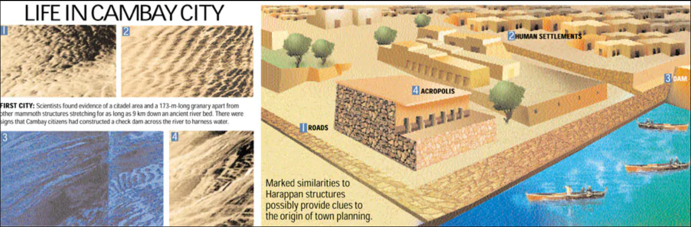 (三)印度洋区域的海底建筑 2001年5月,印度科学和技术部宣布,国家海洋技术研究所NIOT(the National Institute of Ocean Technology)在坎贝湾的海底发现了古老文明的遗迹。该遗迹被称为坎巴特湾文化遗迹GKCC(Gulf of Khambhat Cultural Complex)。它位于印度西海岸外20公里处,长约9公里,深约30到40米。考古发现了排列规则的房屋,粮仓,浴场,排水系统,道路以及整齐排列的房间等,以及火烧过的痕迹。 印度国家地球物理研究所NGRI(the National Geophysical Research Institute),印度古植物学研究所BSIP(Birbal Sahni Institute of Palaeosciences)和印度位于Ahmedabad的物理研究实验室通过碳14测定后,认为坎贝湾的海底遗迹可追溯至9500年前。  图18:印度坎巴特湾文化遗迹 |