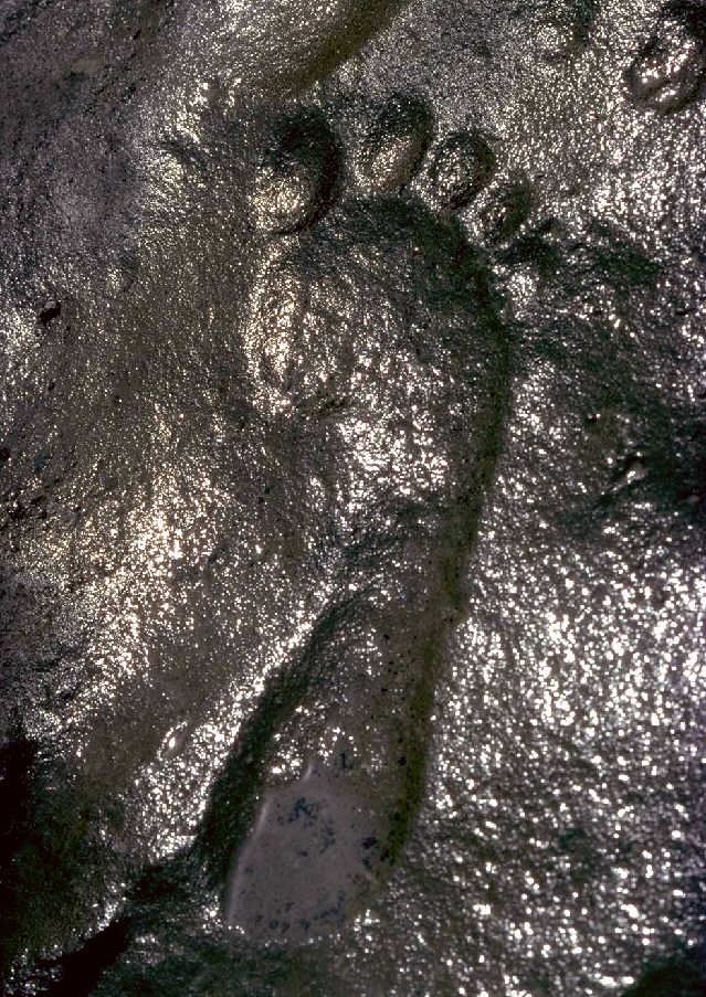 科学家科德尔(Cordell VanHuse)用金刚电锯将光脚孩子的化石切成片,通过研究断面来分析该脚印的真实性。如果该化石是人工雕刻出来的,那么其内部结构必然不会存在脚踩上时形成的压力线。通过分析断面可以看到,内部纹理与脚印的凹陷形状保持一致,尤其可以清晰的看到脚趾与脚跟部位的压力线。这确实是一个真实的孩子的脚印化石。  图3:光脚小孩脚印化石 |