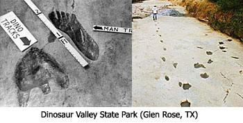 这样的化石还有很多,但值得注意的是,史前文明的历史遗迹大多遭到了破坏。能保存下来的多数是受到私人收藏者的保护。比如,美国德克萨斯州的格伦罗斯地区(Glen Rose),曾经有大量恐龙足迹与人类足迹混合在一起的遗迹。但在1970年左右,政府在建立恐龙峡谷公园(Dinosaur Valley State Park)时,人类足迹部份却被秘密破坏掉了。  图9:人类与恐龙脚印化石的历史照片(目前人类部份已被拆除) |