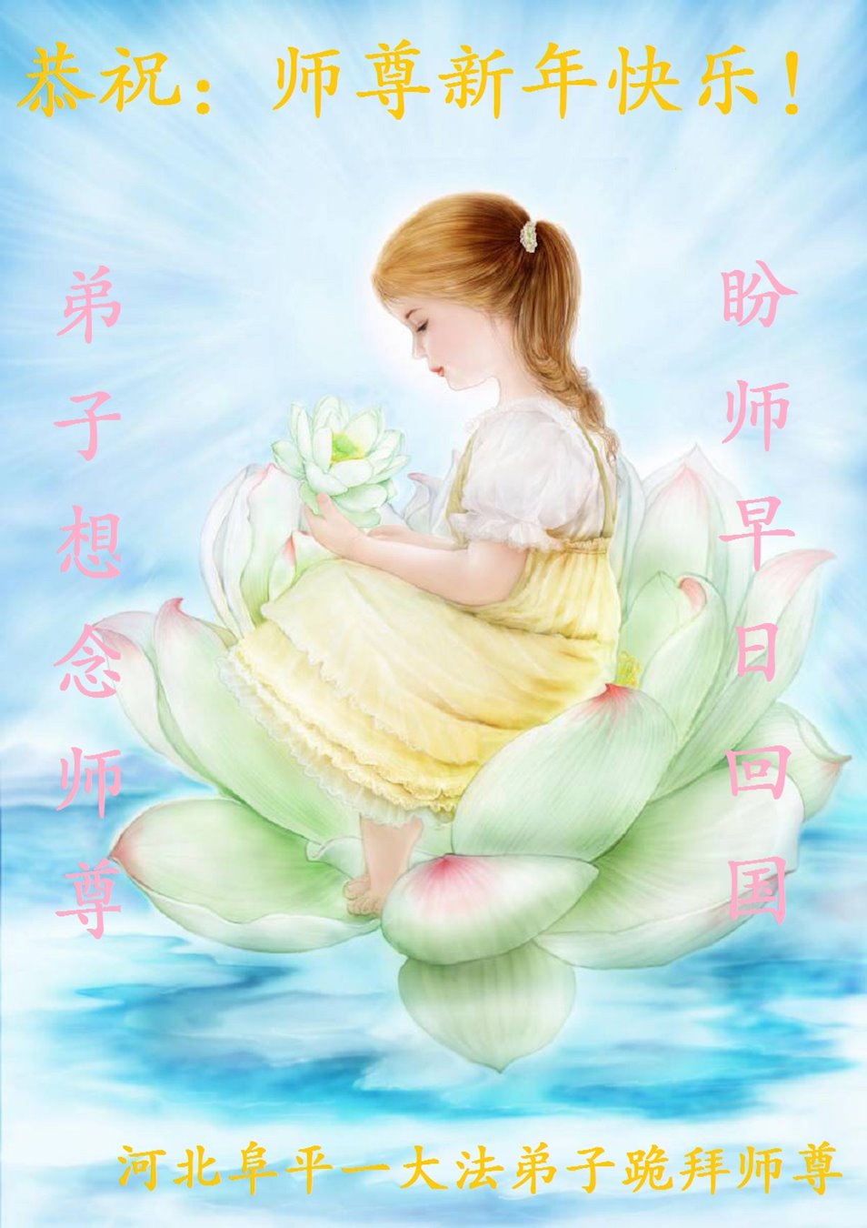 邯郸市广平县一大法弟子携全家恭祝师尊新年快乐!师尊您好!我们全家人感谢师尊的救度之恩!全家人跪拜师尊!合十 河北省邯郸市广平县一小组大法弟子恭祝慈悲伟大的师尊新年快乐!
