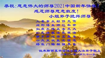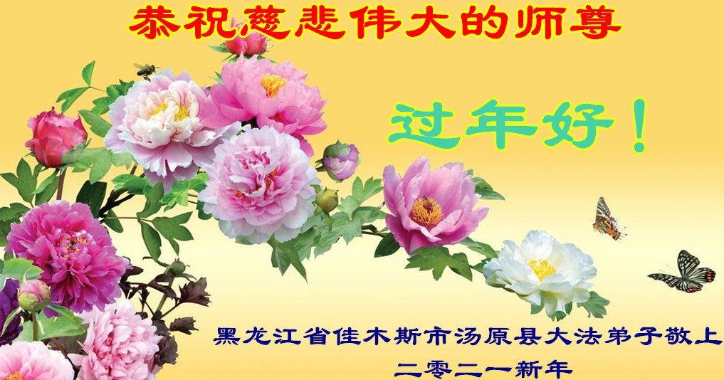 恭祝慈悲伟大的师尊新年好! 黑龙江省汤原县一家大法弟子夫妻敬上 二零二一新年 黑龙江省佳木斯市中部一学法小组全体大法弟子恭祝师尊新年好!