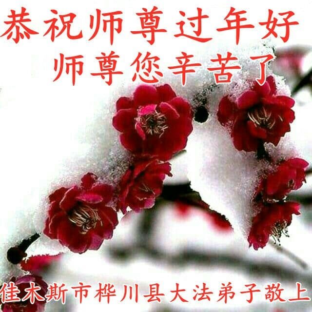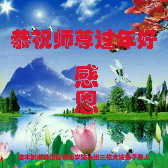 法轮大法好!真善忍好! 感恩师尊二十多年的保护,感恩师尊慈悲救度! 师尊您辛苦了! 黑龙江省佳木斯市桦川县一学法小组三位大法弟子敬上 黑龙江省佳木斯市一家俩口大法弟子恭祝师尊过年好!