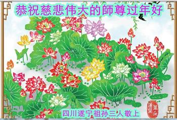 四川省西昌市一大法弟子携同家人恭祝师尊新年快乐!弟子一定按照师尊要求去做,让更多的家人明白真相得救度。 四川遂宁市祖孙三人恭祝慈悲伟大的师尊过年好!
