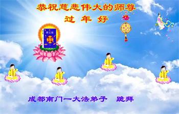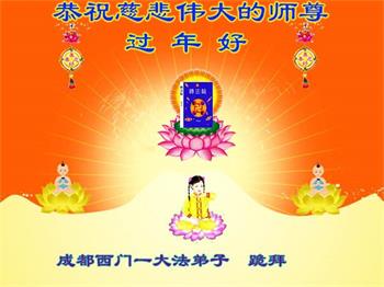成都一老年大法弟子恭祝师尊新年快乐!师父您辛苦了! 成都一老年大法弟子敬上 四川省成都市南门一大法弟子恭祝师尊过年好!
