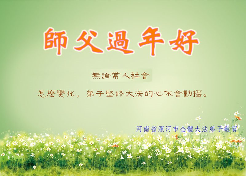 家乡的中国新年又到了,每逢佳节倍思亲。我们全体大法弟子满怀着对慈悲伟大师尊的救度之恩与深情思念,道一声:师父您辛苦了!感恩师尊慈悲救度,谢谢师父!恭祝师尊新年快乐! 在新的一年里,我们全体大法弟子一定精進实修,兑现誓约,做好三件事,让师父多一份欣慰,少一份操劳。紧跟师尊,共同走向美好的家园!谢谢师父!师父新年好! 河南商丘民权县全体大法弟子敬上、合十 二零二零年腊月二十三日 河南省漯河市大法弟子恭祝师尊过年好!
