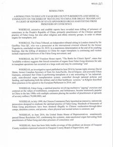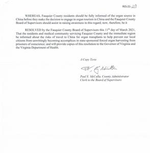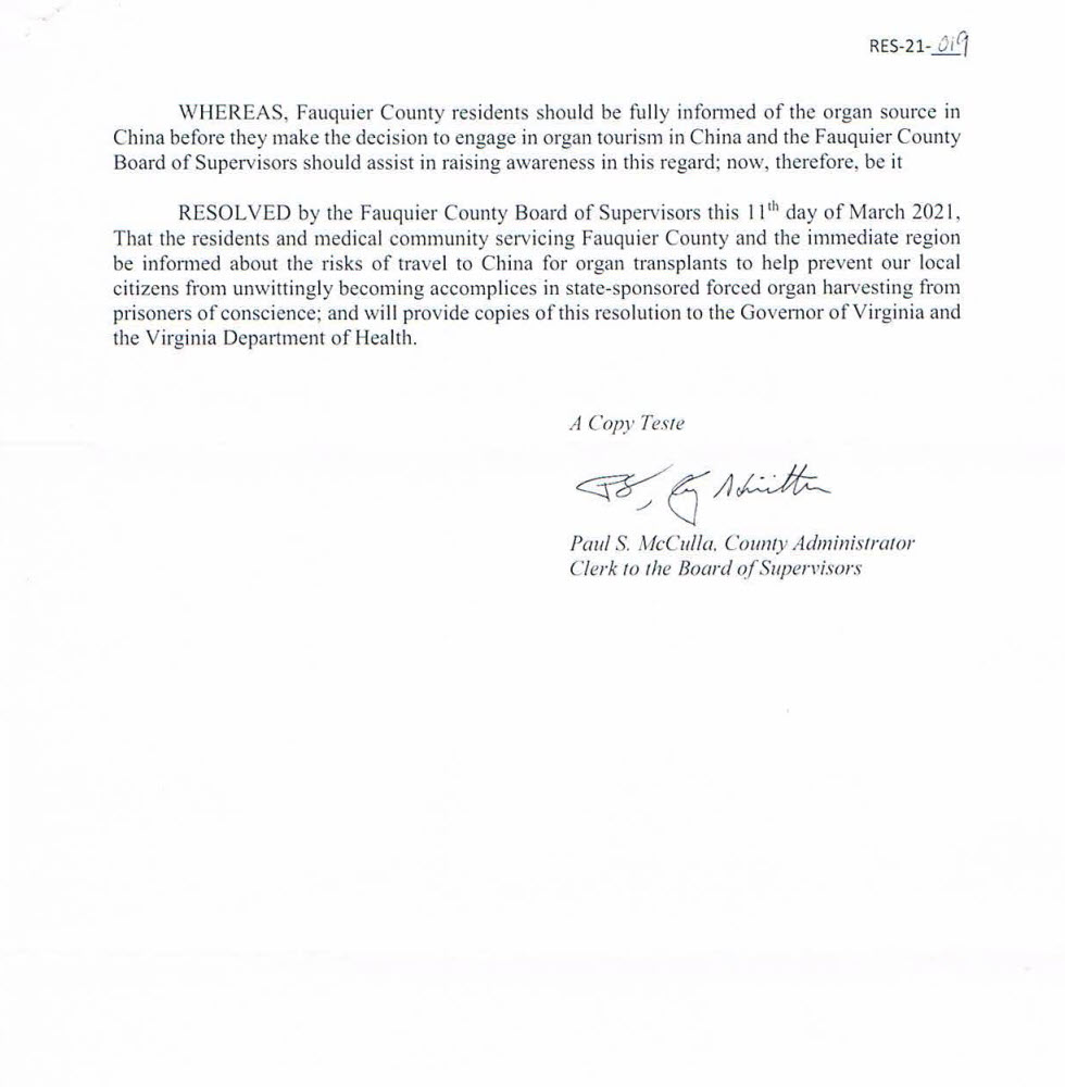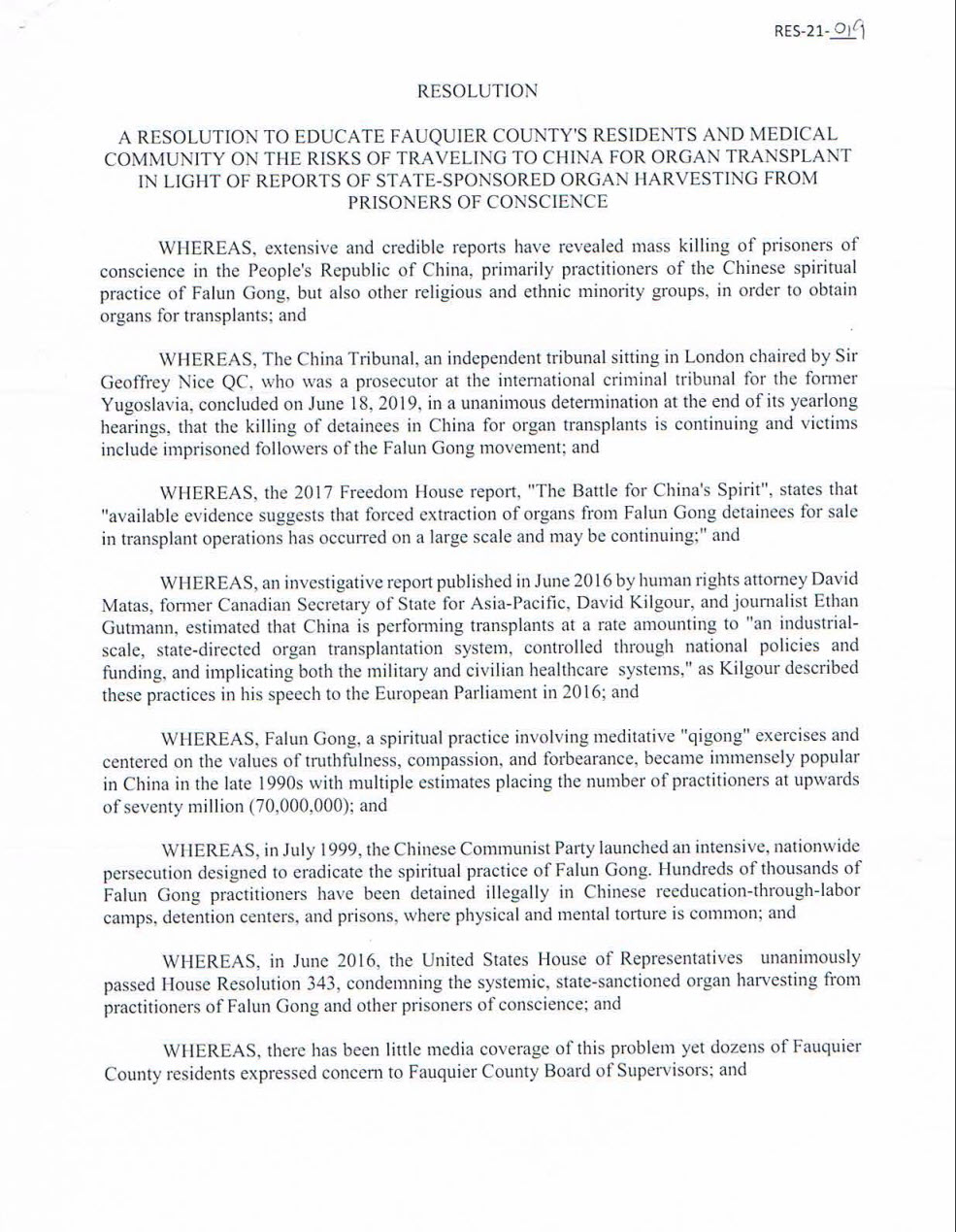 “要让人们知道正在发生的事情,这些器官不是自愿捐献的,而是被强制摘取的。”他说,中共活摘法轮功学员器官的行径“应该停止”。 他表示认为美国联邦政府,“应该和地方政府一样,站出来大声反对中共活摘器官”。 图:美国弗吉尼亚州福基尔县决议案以下是决议案的中文翻译: 决议案根据有关(中共)国家支持的活摘良心犯器官的最近报告,对福基尔县居民和医疗界进行前往中国做器官移植手术的风险教育: 鉴于,广泛和可信的报告显示,在中国存在对良心犯、首要是法轮功修炼者,以及其它宗教和少数群体成员的大规模杀戮,以获取器官做移植手术;以及 鉴于,中国法庭(The China Tribunal),这个位于英国伦敦由大爵士、国际刑事法庭审判前南斯拉夫问题的检察官Geoffrey Nice QC主持的独立法庭,经过长期听证,在二零一九年六月十八日做出判决,一致认定:在中国,杀戮囚犯,用于器官移植手术的行径正在继续,受害者包括被监禁的法轮功学员;以及 鉴于,“自由之家”在二零一七年发布的《中国精神之战》(The Battle for China’s Spirit)报告中指出,“现有证据表明,活摘法轮功囚犯的器官,用于器官移植手术的交易,已经大规模发生,并可能正在继续;”以及 鉴于,由人权律师大卫·麦塔斯(David Matas)、前加拿大亚太事务卿大卫·乔高(David Kilgour)、记者伊桑·葛特曼(Ethan Gutmann)在二零一六年六月发布的调查报告估计,中国正在以“工业规模、国家指导的器官移植系统、国际政策和资金支持、牵涉到军队和民营医疗系统”的方式进行器官移植,就如大卫·乔高在二零一六年欧洲议会演讲中所描述的那样;以及 鉴于,法轮功,是以真、善、忍价值为核心,融合了气功打坐的精神修炼功法,二十世纪九十年代在中国广受欢迎;据多项估计,法轮功学员人数当时达到了七千万人以上;以及 鉴于,一九九九年七月,中国共产党发起了旨在消灭法轮功的全国性的严重迫害。成千上万的法轮功学员被非法拘留在中共的劳教再教育场所、拘留所和监狱中,普遍遭受酷刑迫害和精神折磨;以及 鉴于,二零一六年六月,美国国会众议院一致通过了343号决议案,谴责对法轮功学员和其他良心犯的系统性的、国家认可的活摘器官行径;以及 鉴于,几乎没有媒体对此问题予以报导,但数十位福基尔县的居民向福基尔县委员会(Fauquier Board of Supervisors)表达关注;以及 鉴于,福基尔县居民在决定到中国进行器官移植旅游之前,应该被充分告知中国的器官来源,而福基尔县委员会应协助提升这方面的认知;因此,现在 福基尔县委员会于二零二一年三月十一日决议,通知福基尔县的居民和医疗界有关前往中国进行器官移植的风险,以帮助制止居住在当地的公民无意间成为(中共)国家认可的活摘良心犯器官行径的共谋;并向弗吉尼亚州州长和弗吉尼亚州卫生署提供该决议案的副本。