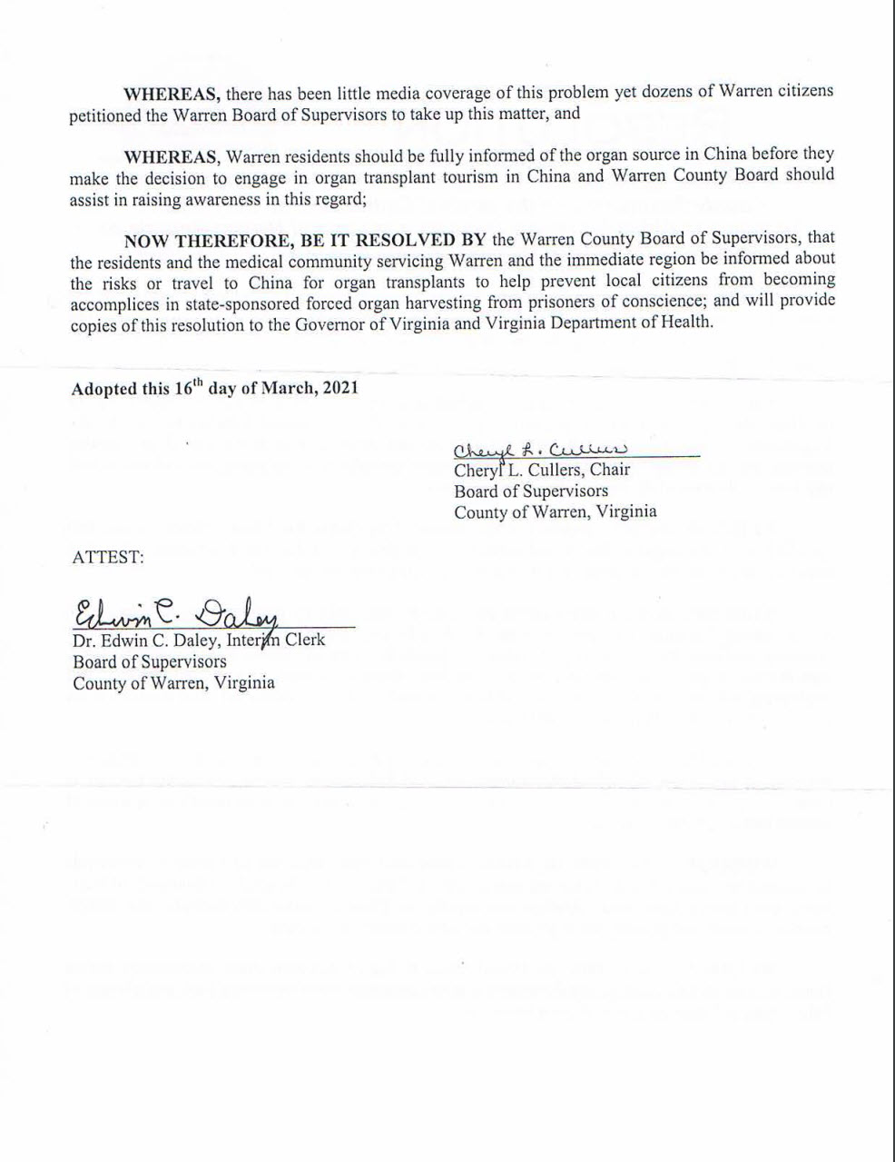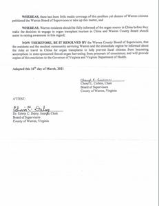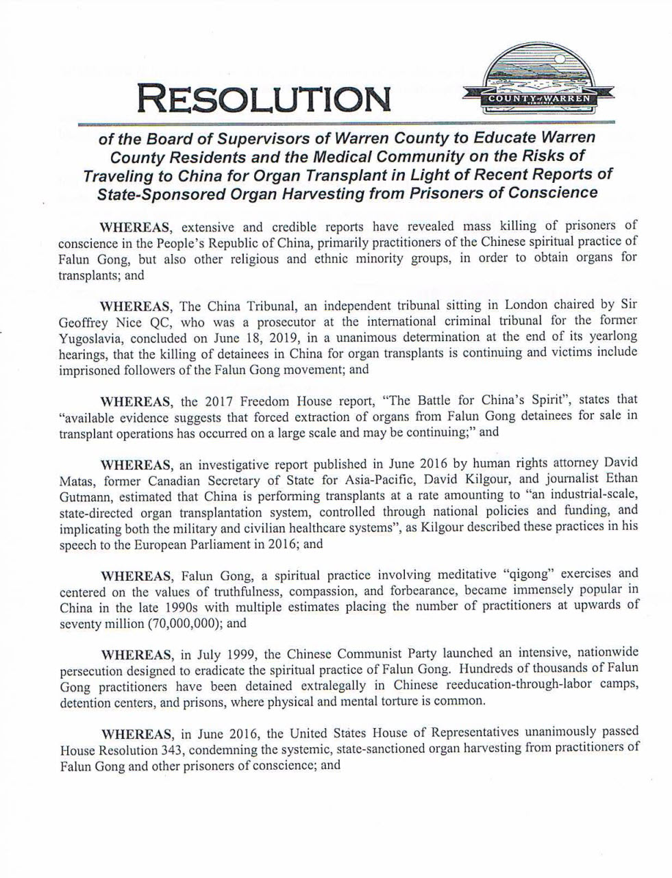 | 【明慧网二零二一年三月二十三日】二零二一年三月十六日晚,美国弗吉尼亚州沃伦县(Warren County)委员会投票,一致通过一项决议案,谴责中共活摘法轮功学员等良心犯器官的非人行径。 这是自去年以来,弗吉尼亚州第七个县通过的关于抵制中共活摘器官的决议案。这七个县分别是:费尔法克斯(Fairfax)、仙纳度县(Shenandoah)、弗雷德里克县(Frederick)、威廉王子县(Prince William)、劳登县( Loudoun )、福基尔县(Fauquier )、沃伦县(Warren)。 此外,去年,二零二零年,弗吉尼亚州四十九位州议员联署致信美国前国务卿蓬佩奥(Mike Pompeo),要求美国国务院帮助制止中共对法轮功的迫害,关注中共活摘法轮功学员器官的罪行。 沃伦县委员沃尔特‧马布(Walter Mabe)接受媒体采访时表示:“我相信这个决议案将帮助人们了解正在发生的事情,以及(帮助)如何解决这个问题。” 马布先生并说,中共活摘法轮功学员器官“这是反人类罪,这和人相关,我们都是这个世界的一部份。我们都应该站出来反对”。 图:弗吉尼亚州沃伦县决议案以下是沃伦县决议案的全文翻译: 决议案 根据(中共)国家支持的活摘良心犯器官的最近报告,对沃伦县居民和医疗界进行前往中国做器官移植手术的风险教育。 鉴于,广泛和可信的报告显示,在中国存在对良心犯、首要是法轮功修炼者,以及其它宗教和少数群体成员的大规模杀戮,以获取器官做移植手术;以及 鉴于,中国法庭(The China Tribunal),这个位于英国伦敦由大爵士、国际刑事法庭审判前南斯拉夫问题的检察官Geoffrey Nice QC主持的独立法庭,经过长期听证,在二零一九年六月十八日做出判决,一致认定:在中国,杀戮囚犯,用于器官移植手术的行径正在继续,受害者包括被监禁的法轮功学员;以及 鉴于,“自由之家”在二零一七年发布的《中国精神之战》(The Battle for China’s Spirit)报告中指出,“现有证据表明,活摘法轮功囚犯的器官,用于器官移植手术的交易,已经大规模发生,并可能正在继续;”以及 鉴于,由人权律师大卫‧麦塔斯(David Matas)、前加拿大亚太事务卿大卫‧乔高(David Kilgour)、记者伊桑‧葛特曼(Ethan Gutmann)在二零一六年六月发布的调查报告估计,中国正在以“工业规模、国家指导的器官移植系统、国际政策和资金支持、牵涉到军队和民营医疗系统”的方式进行器官移植,就如大卫‧乔高在2016年欧洲议会演讲中所描述的那样;以及 鉴于,法轮功,是以真、善、忍价值为核心,融合了气功打坐练习的精神修炼功法,二十世纪九十年代在中国广受欢迎;据多项估计,法轮功学员人数当时达到了七千万人以上;以及 鉴于,一九九九年七月,中国共产党发起了旨在消灭法轮功的全国性的严重迫害。成千上万的法轮功学员被非法拘留在中共的劳教再教育场所、拘留所和监狱中,普遍遭受酷刑迫害和精神折磨; 鉴于,二零一六年六月,美国国会众议院一致通过了343号决议案,谴责对法轮功学员和其他良心犯的系统性的、国家认可的活摘器官行径;以及 鉴于,几乎没有媒体对此问题予以报导,但数十位沃伦县的居民向沃伦县委员会(Warren Board of Supervisors)表达关注;以及 鉴于,沃伦县居民在决定到中国进行器官移植旅游之前,应该被充分告知中国的器官来源,而沃伦县委员会应协助提升这方面的认知; 因此,现在由沃伦县委员会决议,通知沃伦县的居民和医疗界有关前往中国进行器官移植的风险,以帮助制止居住在当地的公民无意间成为(中共)国家认可的活摘良心犯器官行径的共谋;并向弗吉尼亚州州长和弗吉尼亚州卫生署提供该决议案的副本。 二零二一年三月十六日通过。 (决议案的英文原文):https://documentcloud.adobe.com/link/track?uri=urn:aaid:scds:US:86f9fea2-ef1b-48e3-9e54-29c2cdbfe513#pageNum=87