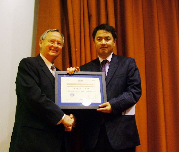 在二十三天的拍摄工作中,我被分配到美术道具组。我尽量地回忆当年插播的场景,使道具能逼真地制作出来。一天,有线信号放大器、主干线有线线缆、电线杆、老式的VCD机等等摆出来了,望着这逼真的还原场景,我的眼睛都舍不得眨一下。 拍摄入戏中我仿佛回到当年的那段时光,禁不住几度热泪盈眶……又与当年的“同伴们”在一起了,酸楚……喜悦……《永恒的五十分钟》这部影片让全世界知道了以前那么不容易的事,让全世界知道了那些法轮大法弟子英雄们的壮举…… 之后影片公映,我最想对那些离世的先行者说:长春“3·05”插播事件的成功,是你们用生命的代价和参与者以及长春法轮功学员巨大的付出。在电影中我们有幸演绎了英雄们在历史上的角色,我的参与是我本人对你们的追思和敬意,不是为了当英雄的你们已经成为了英雄,名垂青史,将来人们会永远记住你们。 是伟大的师尊造就了千千万万正面反抗暴政迫害、敢于坚持真理的大法弟子 二零零七年,亚太人权基金会将本年度的“丹心汗青奖”,授予打破新闻封锁的“3·05”长春插播团队代表——长春法轮功学员刘成军。亚太人权基金会说:刘成军将作为二十世纪中华民族的人权卫士,流芳百世。  法轮功学员张而平(右)代表刘成军接受丹心汗青奖。亚太人权基金会认为,刘成军不仅对百万观众介绍了事实真相,而且为民间维权运动树立了榜样。 |