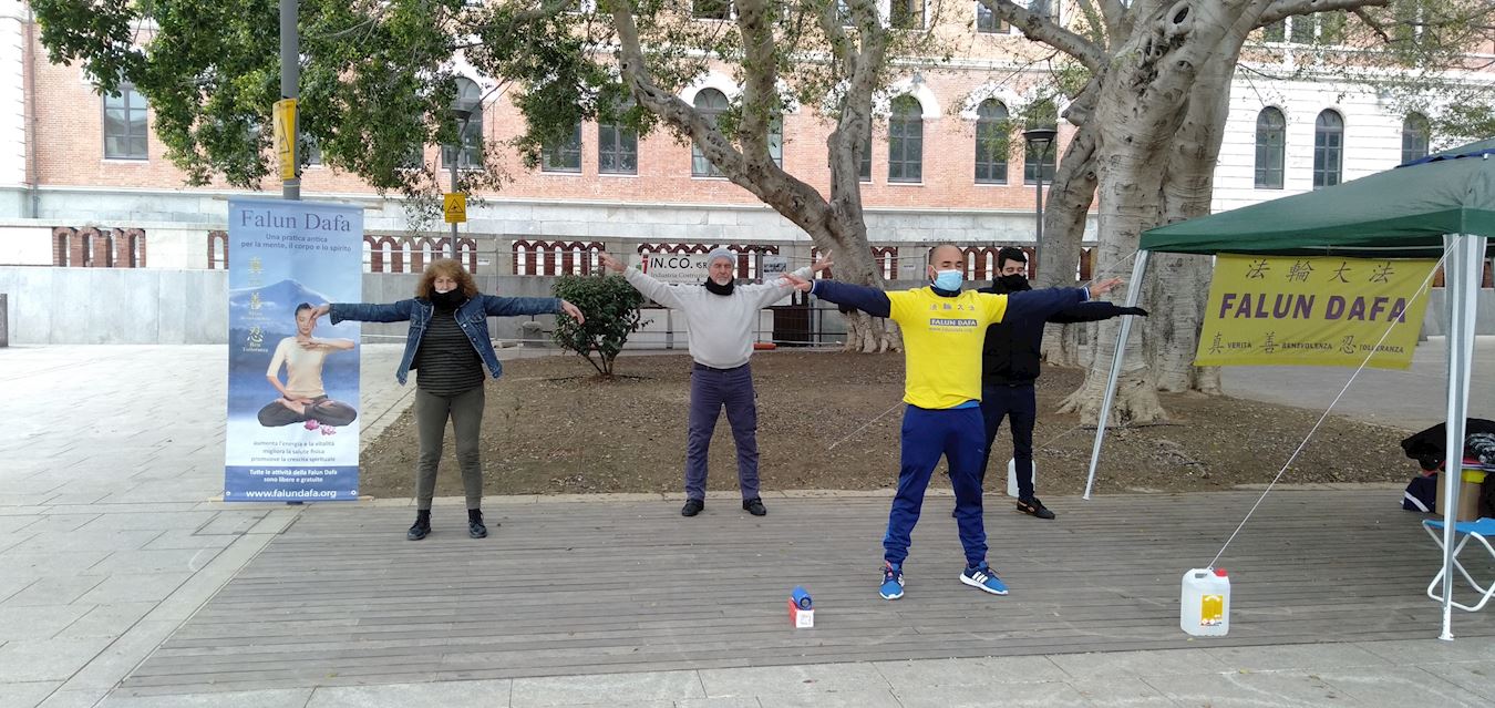 | 【明慧网二零二一年三月七日】二零二一年二月二十七日,意大利撒丁岛部份法轮功学员们,来到首府卡利亚里市中心--加里波第广场,举办讲真相征签活动,向过往的市民传播法轮大法的美好,揭露中共对法轮功的残酷迫害,使许多有缘人明白了真相。 学员们在加里波第广场上摆好法轮功展板、横幅和展台后,大家就伴随着音乐向路人展示法轮功功法。过往不少行人停下脚步观看学员炼功,接受真相资料,了解什么是法轮功,以及为什么信仰“真善忍”的法轮功学员,在中国大陆会遭受群体灭绝迫害。有人主动在停止迫害的请愿书上签名,要求意大利政府立即敦促中共停止迫害法轮功,并对中共的恐怖迫害法轮功学员感到悲伤和愤怒。  图:学员们在加里波第广场上炼功 |