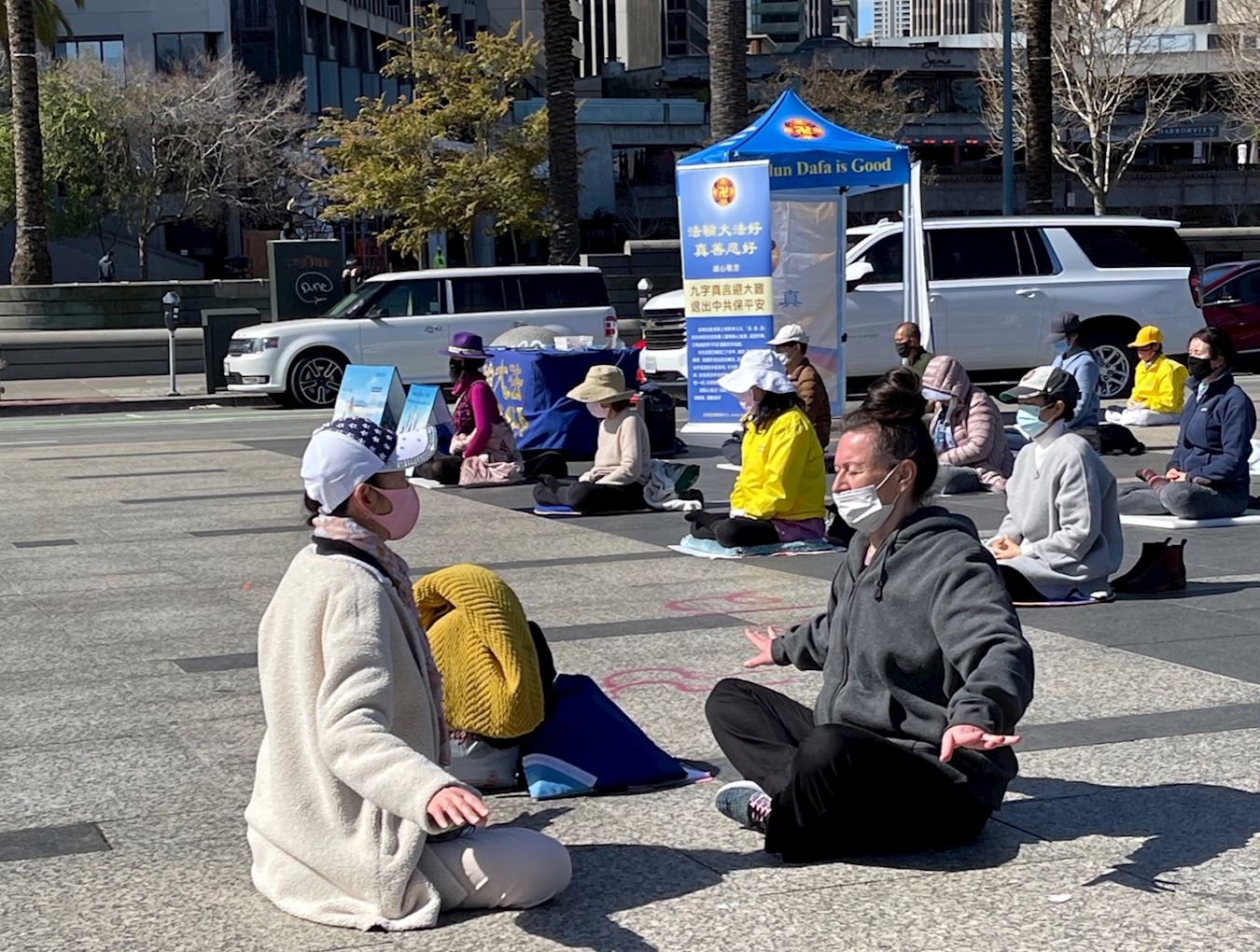 经过前一晚的风雨清洗,当天旧金山的空气格外清新,加上灿烂的阳光,许多人到户外来散步、到渡轮大厦旁的农贸市场购物。法轮功学员祥和的集体炼功场面,吸引了过往人们的目光,他们有的拿出手机拍照,有的驻足了解法轮功,也有的人现场学功。  图4:克里斯多夫(Christopher)和夏伦(Shannon)女士正在跟学员学法轮功的第二套功法——法轮桩法。 |