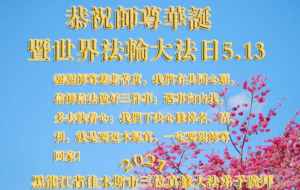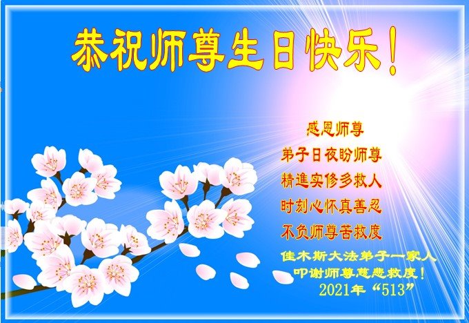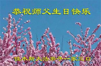 【明慧网二零二一年五月十日】 黑龙江佳木斯大法弟子一家人恭祝师尊生日快乐!
