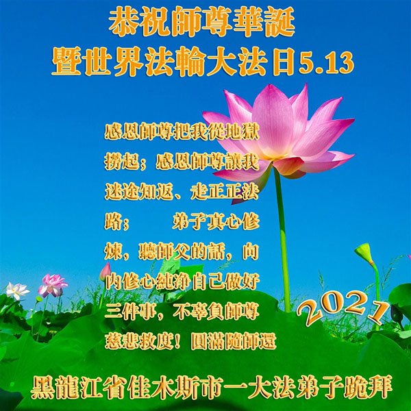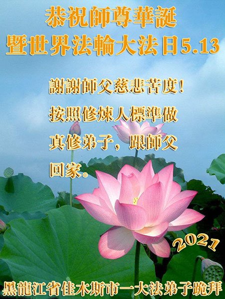 恭祝慈悲伟大的师尊生日快乐!同贺5.13世界法轮大法日! 感恩师尊的慈悲苦度, 解救大穹于危难,愿世人快找真相,快明真相,得到救度。 普天同庆! 跪拜师尊 黑龙江省佳木斯市一大法弟子敬上 2021年5月3日 黑龙江省佳木斯市西部一大法弟子恭祝师尊七十华诞!庆祝世界法轮大法日!