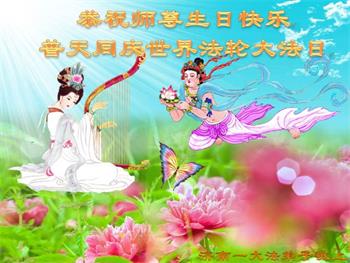 在这普天同庆,世界法轮大法日暨师父华诞的辉煌时刻,作为一名在大法中修炼了二十五年的弟子,恭祝师尊生日快乐!恭祝法轮大法洪传二十九周年! 感恩师尊在二十五年的修炼路上保护,点悟,看护着弟子,为弟子的每一步提高,付出了无数的心血,师尊辛苦了。叩谢师尊。 我们作为大法弟子无论在家庭,社会及方方面面都努力践行做一个道德高尚的好人。 在今后的修炼中,弟子听师尊的教诲。做好三件事修好自己,多救人,不辜负师尊的慈悲苦度。众生的期盼。紧跟师父坚修到底! 山东济南一大法弟子 山东省济南市全家大法弟子恭祝师尊生日快乐!