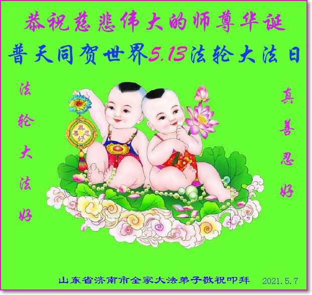 恭贺法轮大法洪传世界二十九年!弟子们一定跟师父回家!叩拜师尊慈悲苦度! 山东济南大法弟子一家人 二零二一年五月五日 山东省济南市大法弟子恭祝师尊生日快乐!恭贺世界法轮大法日!