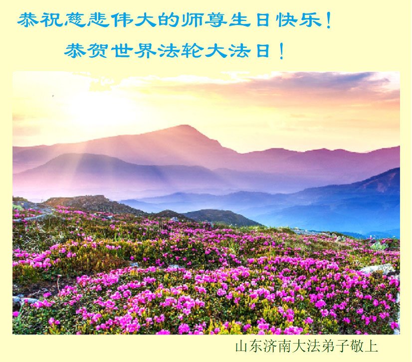 弟子有幸恭逢恩师七十华诞。在这庄严、隆重、喜庆的时光,弟子有万语千言也说不尽师尊二十多年来对弟子的慈悲教诲。 山东济南大法弟子恭贺世界法轮大法日!恭祝慈悲伟大的师尊生日快乐!