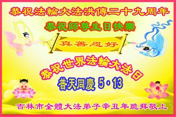吉林市大法弟子恭贺世界法轮大法日!恭祝慈悲伟大的师尊生日快乐!