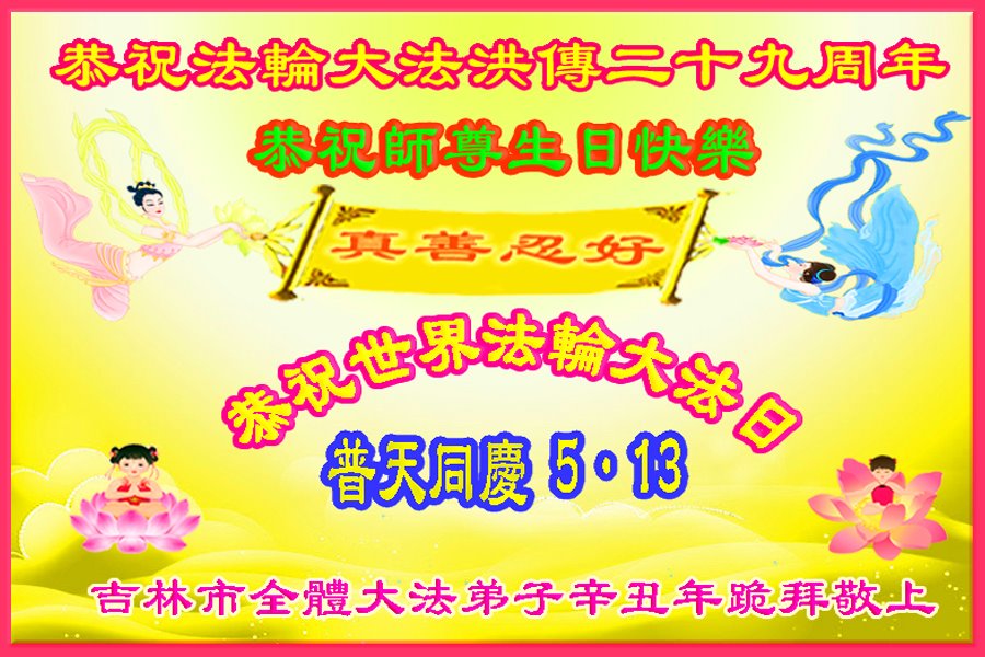 吉林市全体大法弟子恭祝法轮大法洪传二十九周年! 恭祝师尊生日快乐!恭祝世界法轮大法日!普天同庆5.13! 法轮大法好!真善忍好! 我们会学好法,向内找,修好自己,整体配合好,圆容大法,救度更多世人。 吉林市全体大法弟子辛丑年跪拜敬上 吉林省吉林市大法弟子恭祝师尊生日快乐!