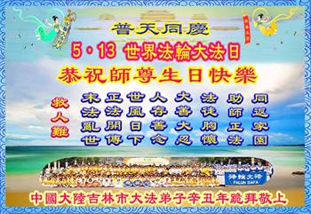 普天同庆5·13 世界法轮大法日!恭祝师尊生日快乐! 中国大陆吉林市大法弟子辛丑年跪拜敬上 吉林省吉林市大法弟子恭贺法轮大法日!