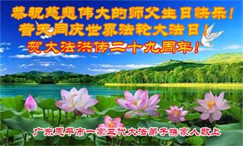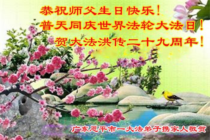 普天同庆世界法轮大法日! 恭祝师父生日快乐! 普天同庆世界法轮大法日!恭贺法轮大法洪传二十九周年! 广东恩平市一大法弟子携家人敬贺 广东省深圳市一大法弟子恭祝慈悲伟大的师父生日快乐!恭贺世界法轮大法日!