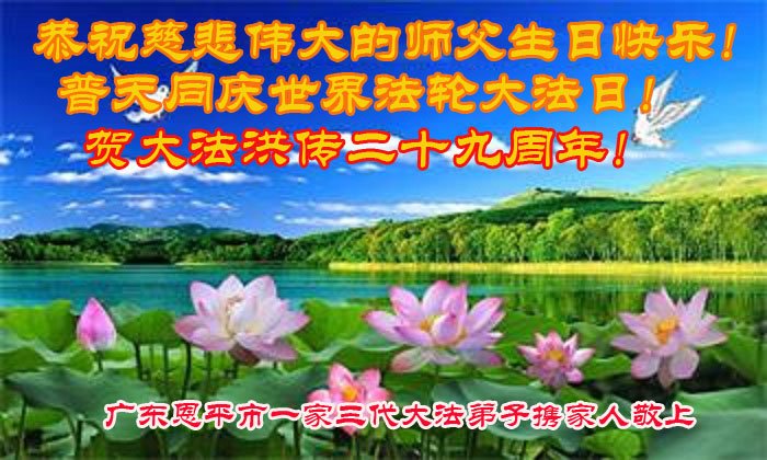恭祝慈悲伟大的师父生日快乐! 普天同庆世界法轮大法日!庆贺大法洪传二十九周年! 广东恩平市一家三代大法弟子携家人敬上 广东省江门市恩平市一大法弟子恭祝慈悲伟大的师父生日快乐!