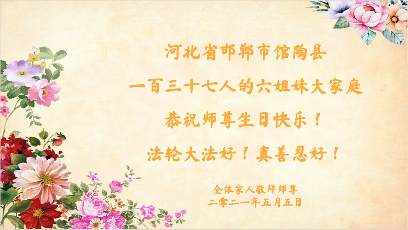 河北省邯郸市馆陶县一百三十七人的六姐妹大家庭恭祝师尊生日快乐! 法轮大法好!真善忍好! 全体家人敬拜师尊 二零二一年五月五日 河北省邯郸市丛台区大法弟子恭贺5・13世界法轮大法日!恭祝师尊生日快乐!师父辛苦了!