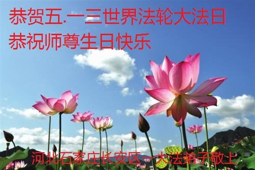 慈悲伟大的师尊好!祝师尊生日快乐! 河北省石家庄长安区五人学法小组大法弟子敬上。 河北石家庄大法弟子恭贺世界法轮大法日!