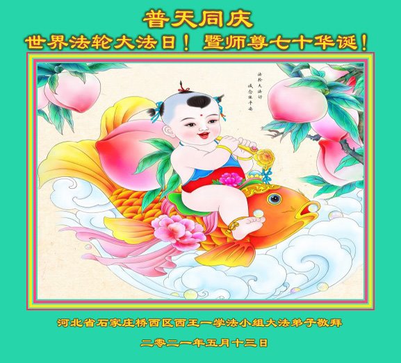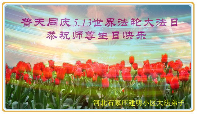在这5.13普天同庆的神圣节日里,弟子首先恭祝师尊生日快乐!热烈庆祝世界法轮大法日! 感恩师尊为救度苍生赐予我们宇宙大法,感谢师尊把我们从地狱捞起走上返本归真之路,弟子一定谨记师尊的教诲,抓紧时间,精進实修,做好三件事,多救人,圆满随师还。 石家庄大法弟子敬上 2021年4月26日 河北石家庄大法弟子恭贺世界法轮大法日!