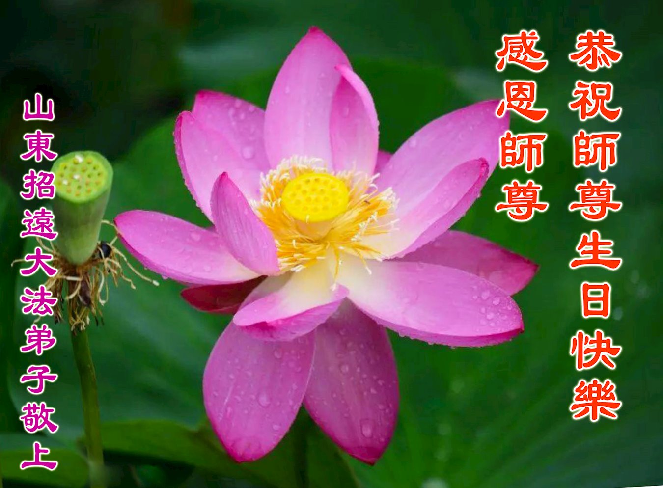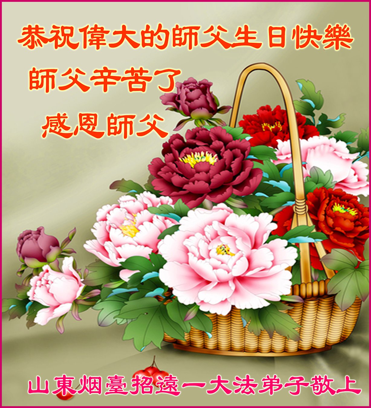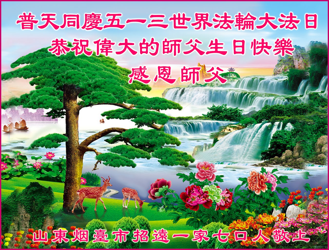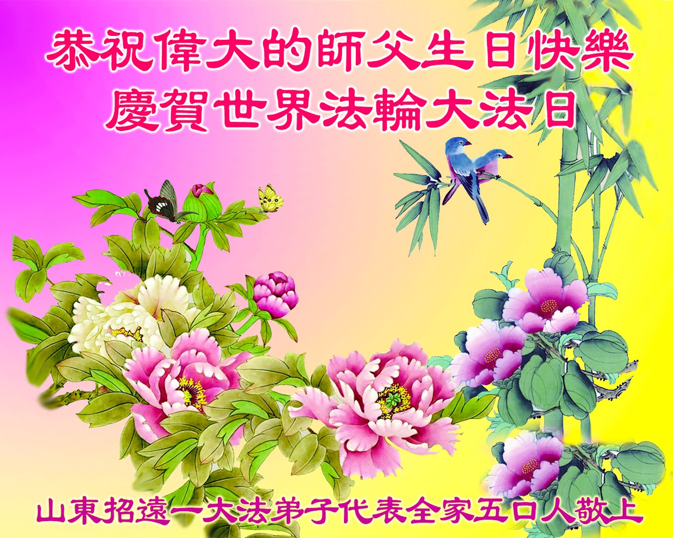 恭祝师父生日快乐!感恩师父的慈悲救度! 我们一定好好修好自己,把大法摆在第一位,走正修炼的路,踏踏实实跟随师父坚定的修炼到底。 山东省烟台市招远市一大法弟子代表全家五口恭祝师父华诞暨世界法轮大法日!