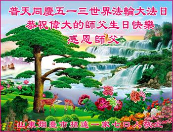 普天同庆五·一三世界法轮大法日! 我们全家人恭祝慈悲伟大的师父生日快乐!恭祝世界法轮大法日! 我们生在大法洪传时代,有幸闻听大法、修炼大法,真是机缘难得。我们会倍加珍惜这万古难遇的高德大法,会紧跟伟大的师父一路走到底。感谢师父的慈悲救度! 山东省烟台招远市两位大法弟子恭祝师尊生日快乐!