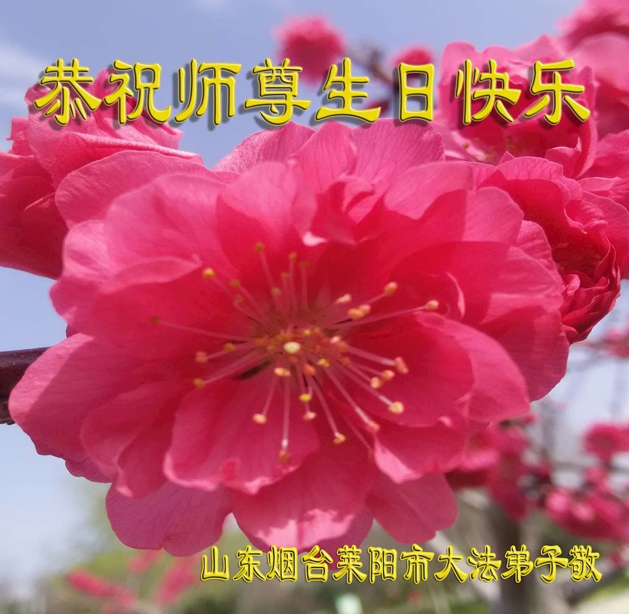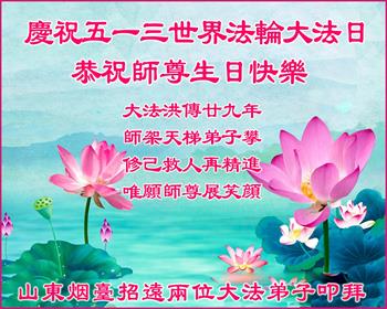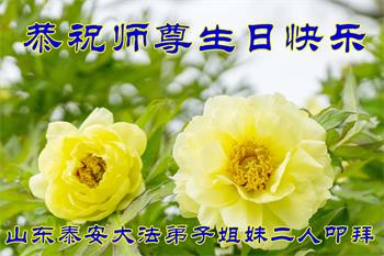 山东东营市大法弟子叩拜师尊,恭祝师尊生日快乐! 同贺世界法轮大法日!恭祝法轮大法洪传29周年! 山东省泰安市姐妹二人大法弟子恭祝师尊生日快乐!