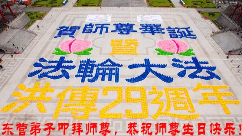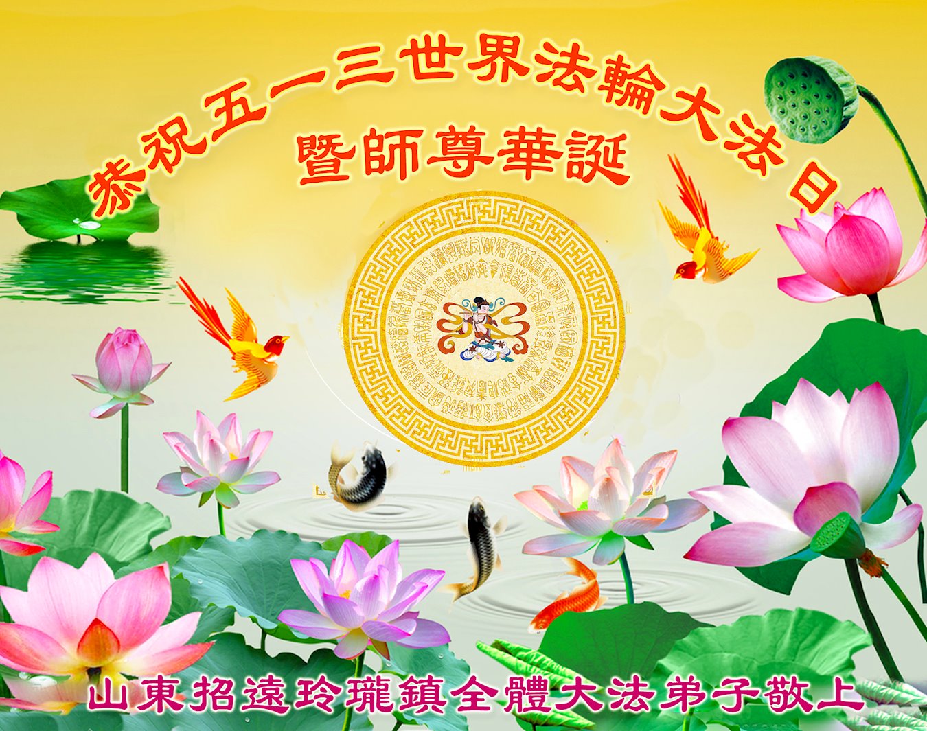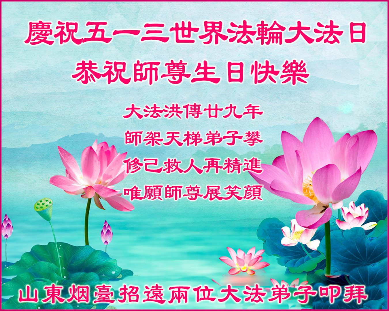 庆祝五·一三世界法轮大法日! 恭祝师尊生日快乐! 庆祝五·一三世界法轮大法日!庆贺法轮大法洪传二十九周年! 大法洪传廿九年 师架天梯弟子攀 修己救人再精進 惟愿师尊展笑颜 山东省烟台市招远市玲珑镇全体大法弟子恭祝师尊生日快乐!