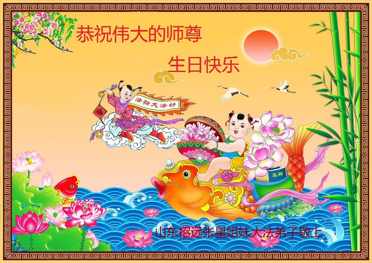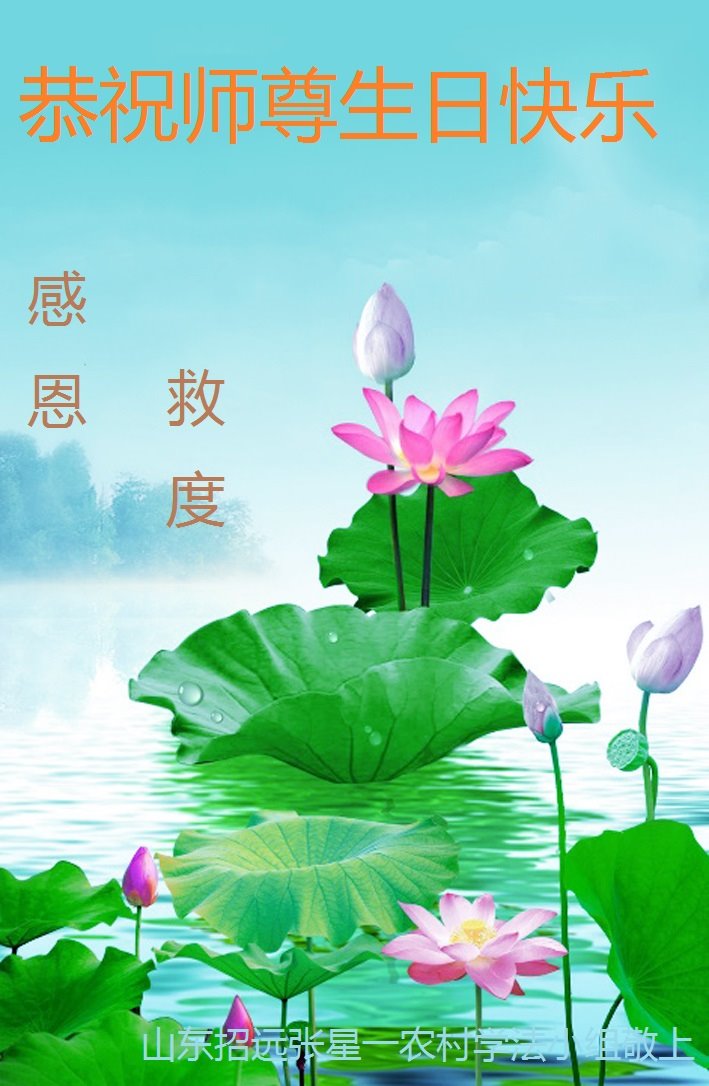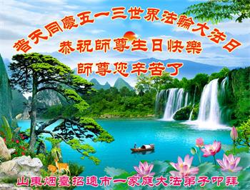 恭贺世界法轮大法日! 弟子全家三位大法弟子在风风雨雨中跟随师尊走到今天,深切的感受到师尊无所不在的慈悲保护与点悟,没有师尊的保护,弟子们不可能在做好三件事中稳步走到今天。弟子真诚的道一声:师尊,您辛苦了!弟子一定努力实修、向内找,发好正念多救人,完成好自己的史前大愿,让师父多一份欣慰,少一点操劳! 山东省烟台市招远市张星镇一学法小组大法弟子恭祝师父生日快乐!