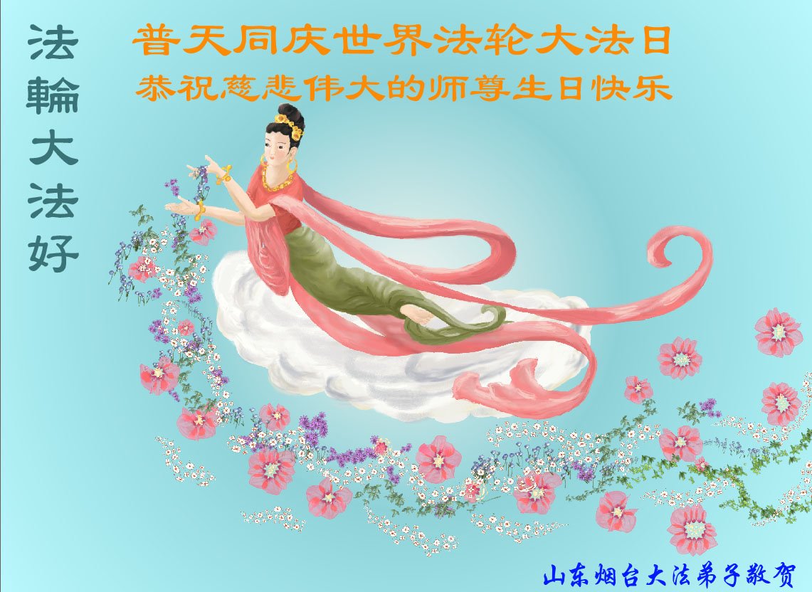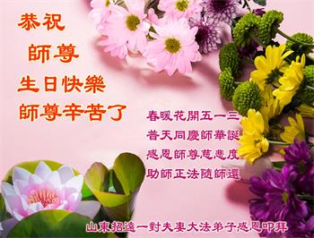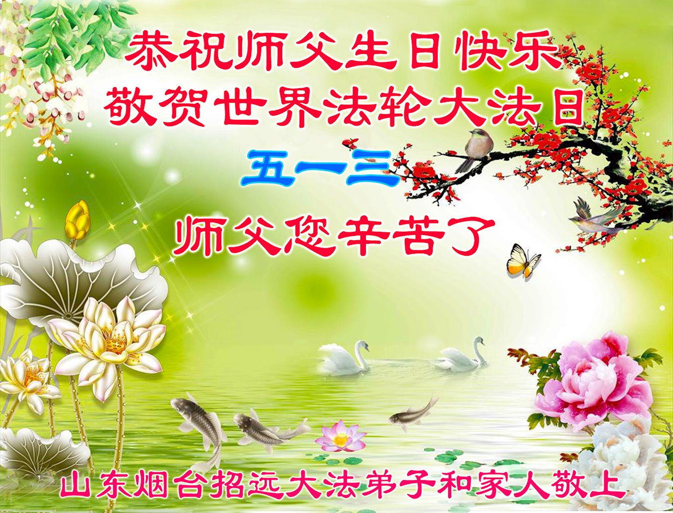 恭祝师尊生日快乐!庆贺世界法轮大法日二十二周年! 春暖花开五一三,普天同庆师华诞,感恩师尊慈悲度,助师正法随师还。 衷心感谢师尊洪传大法!感恩师尊赐予我们的一切!我们夫妻俩是七十多岁的弟子,每天沐浴在大法的佛光普照中,我们从满身业力的常人到现在成为身体健康、心情愉悦的大法徒。从得法那一天开始,二十多年来从来没吃一次药打一次针。我们听师父的话,每天学法,五套功法一步到位。按照“真、善、忍”要求自己,心性在不断的提高。我们以法为师实修自己,在末世乱象中不迷不惑,用师父赋予我们的神通法力,加大力度发正念除恶。我们相信师尊正法必成,一切都在师尊掌控之中。我们一定走正走好师尊安排的路。让更多的众生能够得到大法的救度。 感恩师尊佛恩浩荡。弟子叩拜慈悲伟大的师尊! 山东省烟台市招远市夏甸镇大法弟子恭祝师尊七十华诞暨世界法轮大法日!