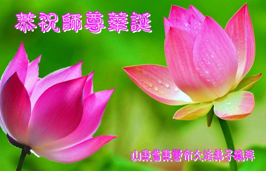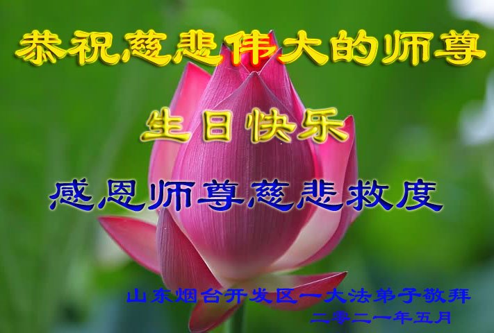 衷心敬祝慈悲伟大的师尊生日快乐! 普天同庆五·一三 师尊华诞七十年 兰花盛开幽香散 莲花出污而不染 彩霞飘飘舒广袖 五位弟子谢师恩 弟子精進不懈怠 圆满随师返家园 山东省烟台市全体大法弟子恭祝慈悲伟大的师尊七十华诞暨世界法轮大法日!