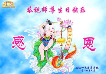 普天同庆世界法轮大法日! 师父好!师父您辛苦了! 谢谢您的慈悲救度,谢谢您每时每刻保护我们,使我们才能修炼法轮大法。我一定要清除各种执着心,修好自己,做个真修弟子。无尽的感恩! 叩谢 上海市静安区一大法弟子敬上 上海市大法弟子恭祝师尊生日快乐!