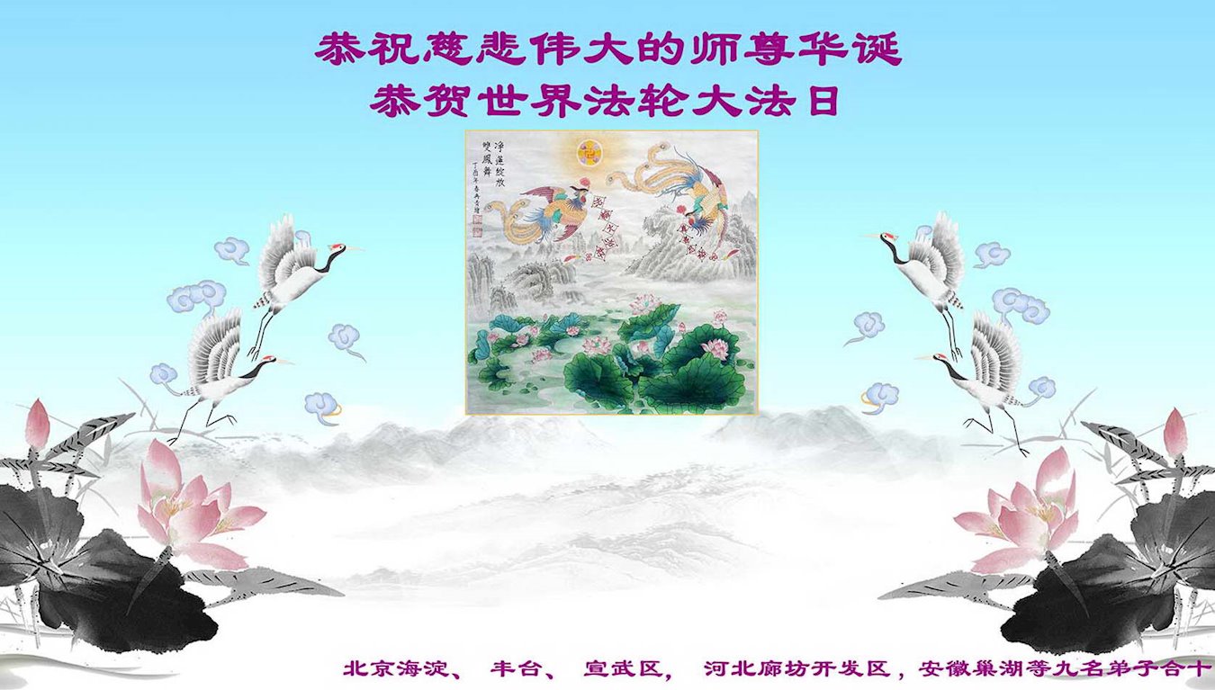北京海淀区、丰台区、宣武区,河北廊坊开发区,安徽巢湖等九名弟子恭祝慈悲伟大的师尊华诞!恭贺世界法轮大法日!