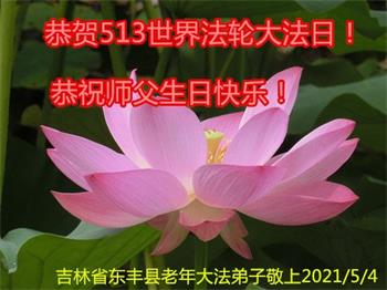 【明慧网二零二一年五月十一日】 吉林省辽源市东丰县老年大法弟子恭贺法轮大法日!