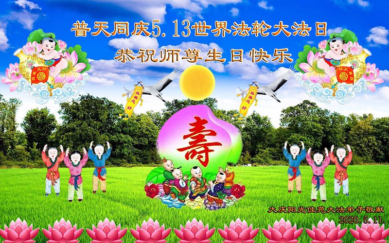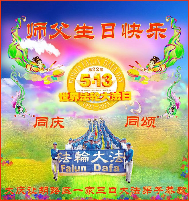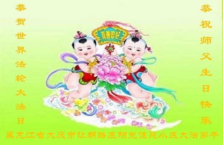 【明慧网二零二一年五月十一日】 黑龙江省大庆市让胡路区阳光佳苑小区大法弟子恭贺世界法轮大法日!恭祝师父生日快乐!