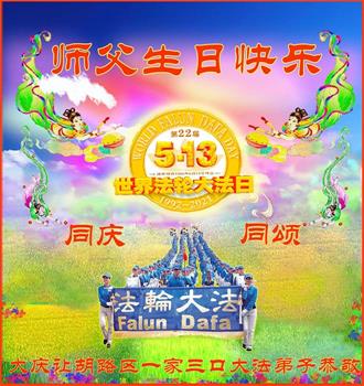 黑龙江省大庆市让胡路区阳光嘉城一家三位大法弟子恭贺世界法轮大法日!恭祝慈悲伟大的师父生日快乐!