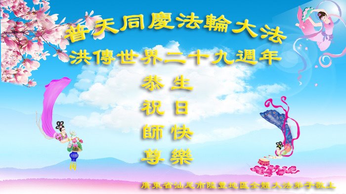 广东省汕尾市陆丰地区全体大法弟子恭贺法轮大法洪传二十九周年!恭祝师尊生日快乐!弟子感谢师尊慈悲救度!
