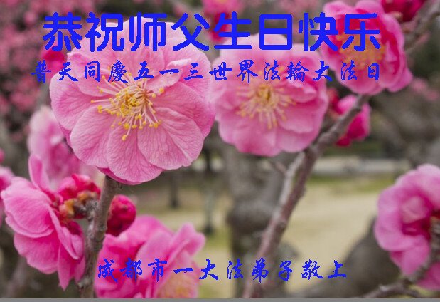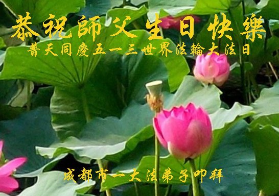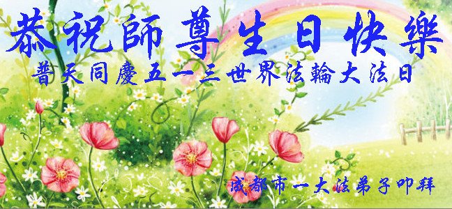 师尊您好! 谢谢师尊对弟子的慈悲苦度,弟子唯有精進修炼,感恩师尊的慈悲苦度,并恭祝师尊生日快乐!同庆五一三世界法轮大法日! 四川省成都一大法弟子恭祝师尊生日快乐!普天同庆五一三世界法轮大法日!