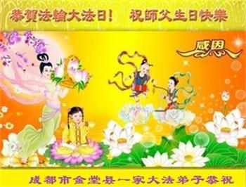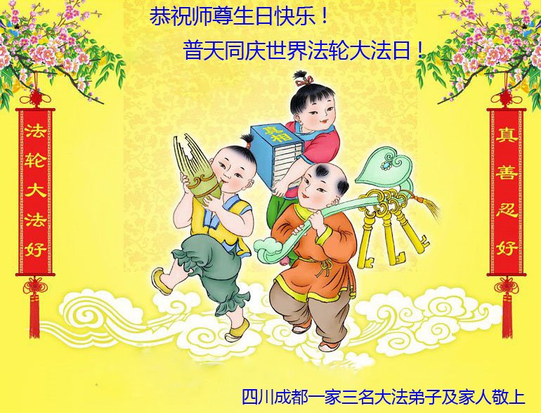 四川成都市一家大法弟子及家人恭祝师尊生日快乐!恭贺法轮大法洪传29周年!普天同庆世界法轮大法日!