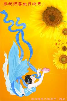 是法轮大法照亮了我的心田,给我指明了人生的方向,让我从一个自私、狭隘、妒嫉、怨恨等负面思维中走出来,成为一个诚实善良、心胸宽广、光明磊落、做事能为他人着想的人。是师尊把我从地狱中捞起、洗净、升华,让我的生命境界得到了提升!在普天同庆世界法轮大法日之际,感谢师尊的慈悲救度!感恩师尊的一路保护! 恭祝师尊生日快乐!庆祝法轮大法洪传世间二十九周年! 江苏省盐城市俩大法弟子恭贺法轮大法日!