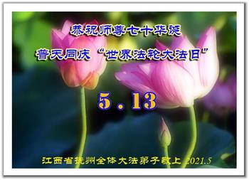 在2021年5月13日世界法轮大法日来临之际,与全世界大法弟子同庆大法洪传世间29周年!感激师尊的慈悲救度之恩!感恩师尊的慈悲保护与加持!无法用人间的语言来表达对师尊的感恩与敬仰,我将倾尽我的所有,付出我的全部来践行“正法时期大法弟子”的责任与使命。千言万语,唯有以更加精進之心回报师恩。 全体大法弟子跪拜师尊 江西省全体大法弟子恭祝师父生日快乐!普天同庆5.13世界法轮大法日!